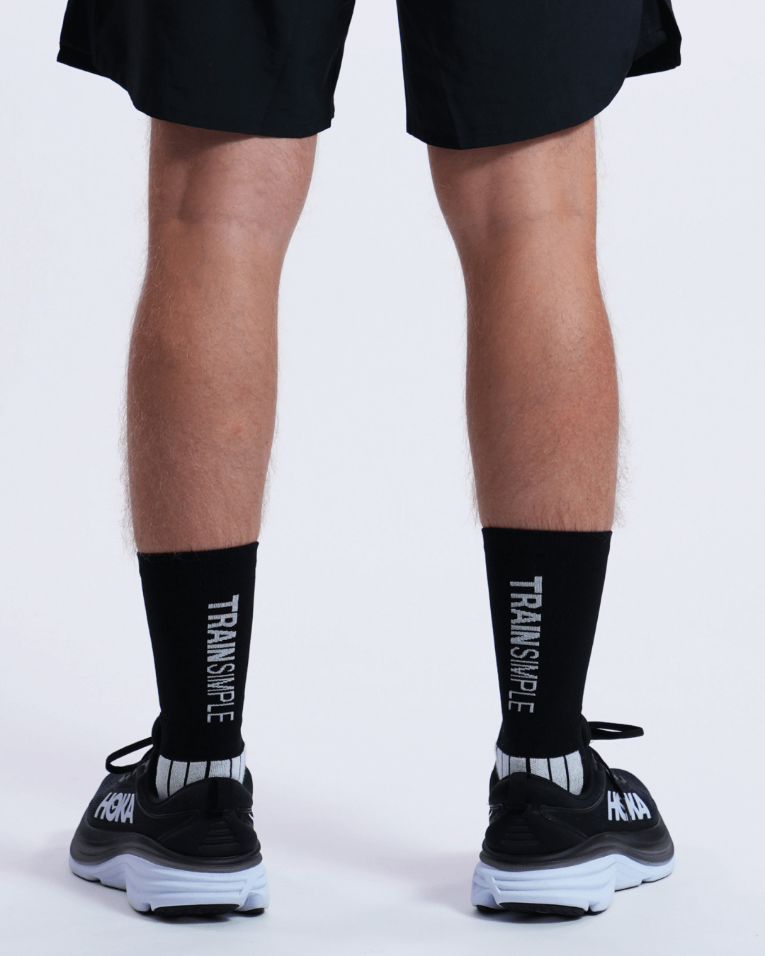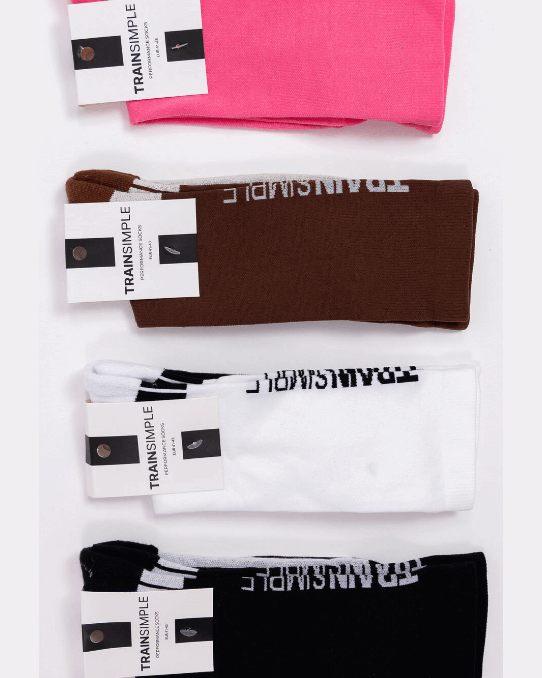 Få en sportig och snygg look med våra löparstrumpor med kompression som förbättrar blodcirkulationen och minskar muskeltrötthet. Strumporna har Trainsimple-logotypen på vaden och kombinerar mjukhet och komfort, vilket gör dem perfekta för dina löprundor.